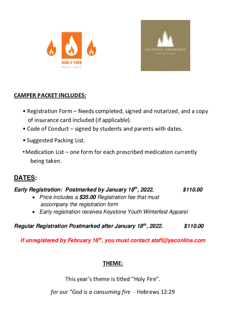 CAMPER PACKET INCLUDES: Registration Form Needs completed, signed and notarized, and a copy of insurance card included (if applicable). Code of Conduct signed by students and parents with dates. Suggested