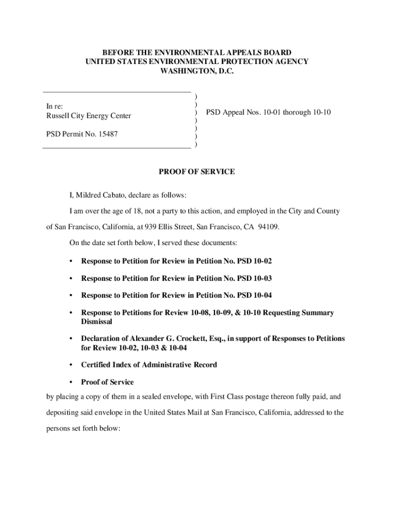 BEFORE THE ENVIRONMENTAL APPEALS BOARD UNITED STATES ENVIRONMENTAL PROTECTION AGENCY WASHINGTON, D.C.) ))))))In re: Russell City Energy Center PSD Permit No. 15487PSD Appeal Nos. 1001 thorough 1010PROOF