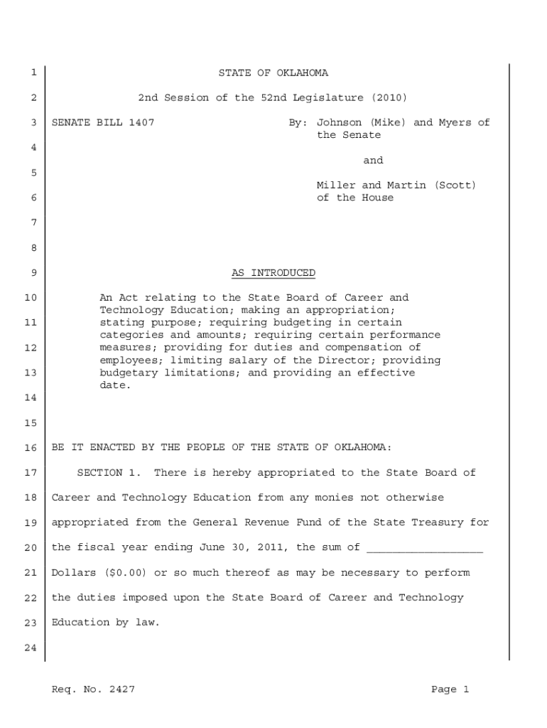 1STATE OF OKLAHOMA22nd Session of the 52nd Legislature (2010)3SENATE BILL 1407By: Johnson (Mike) and Myers of the Senate4 and 5 Miller and Martin (Scott) of the House6 7 8 9AS INTRODUCED10An Act relating
