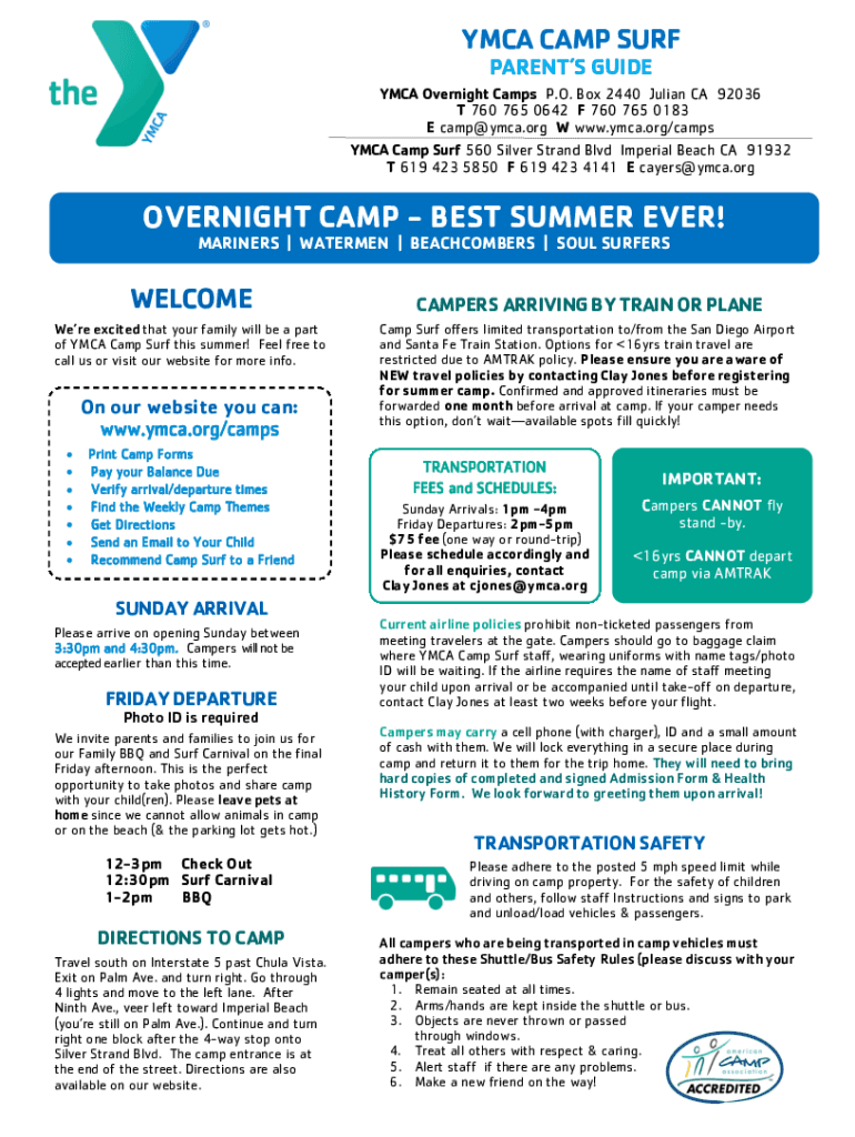 YMCA CAMP SURF PARENTS GUIDE YMCA Overnight Camps P.O. Box 2440 Julian CA 92036 T 760 765 0642 F 760 765 0183 E camp@ymca.org W www.ymca.org/camps YMCA Camp Surf 560 Silver Strand Blvd Imperial Beach