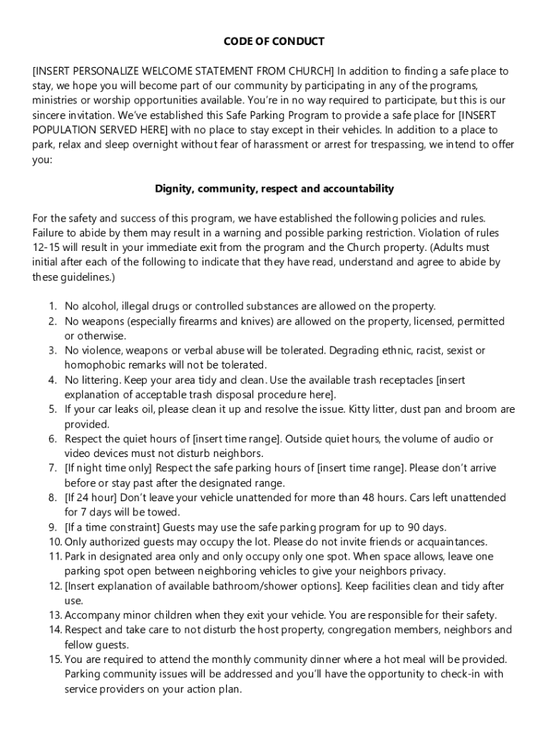 CODE OF CONDUCT [INSERT PERSONALIZE WELCOME STATEMENT FROM CHURCH] In addition to finding a safe place to stay, we hope you will become part of our community by participating in any of the programs,