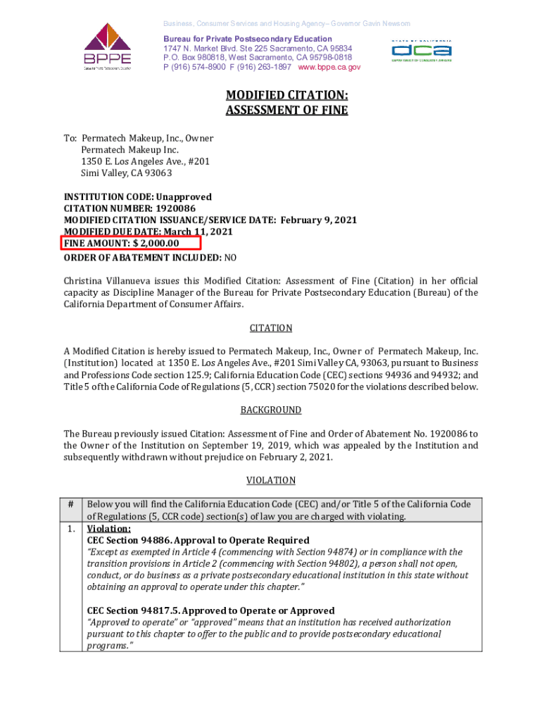 Get the free Bureau for Private Postsecondary Education - Modified Citation
