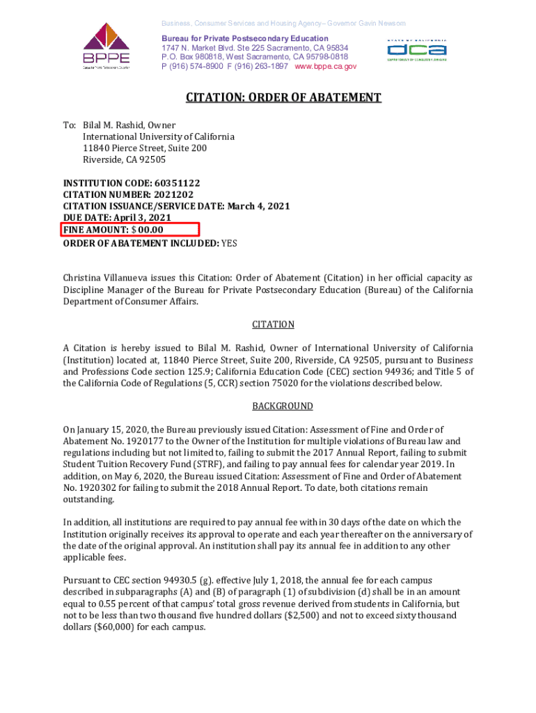 Get the free Bureau for Private Postsecondary Education - International University of California ...