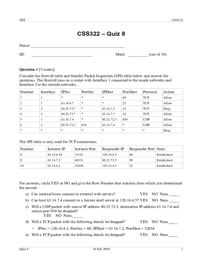 SIITCSS322CSS322 Quiz 8 Name: ___ ID:___Mark: ___ (out of 10)Question 1 [5 marks] Consider the firewall table and Stateful Packet Inspection (SPI) table below and answer the questions. The firewall