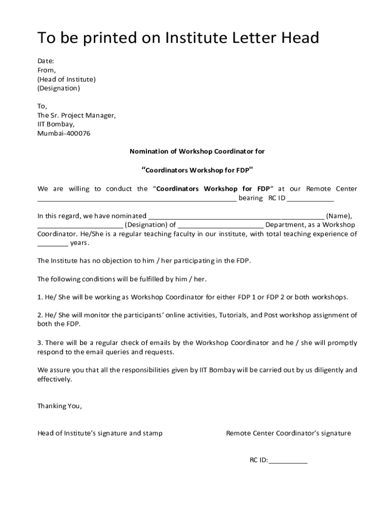 To be printed on Institute Letter Head Date: From, (Head of Institute) (Designation) To, The Sr. Project Manager, IIT Bombay, Mumbai400076 Nomination of Workshop Coordinator coordinators Workshop