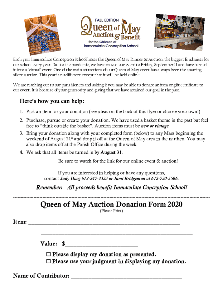 Each year Immaculate Conception School hosts the Queen of May Dinner & Auction, the biggest fundraiser for our school every year. Due to the pandemic, we have moved our event to Friday, September
