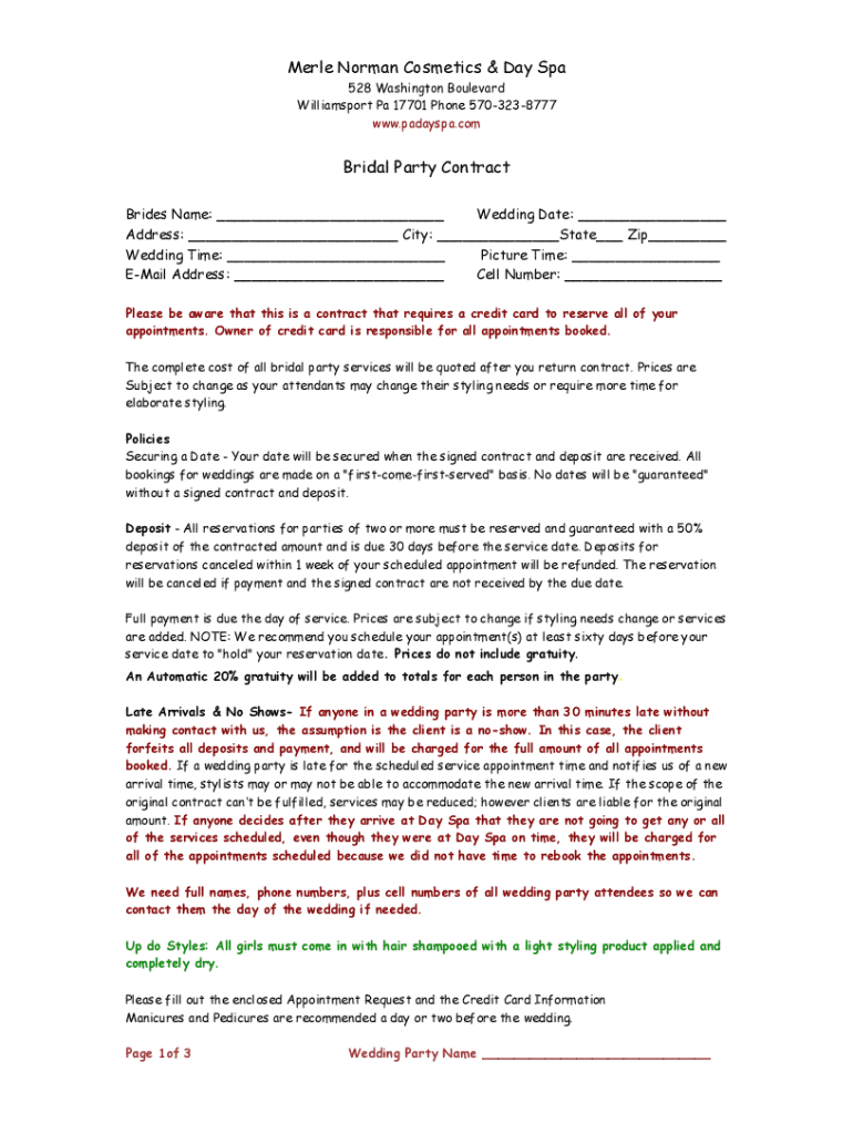 Merle Norman Cosmetics & Day Spa 528 Washington Boulevard Williamsport Pa 17701 Phone 5703238777 www.padayspa.comBridal Party Contract Brides Name: ___ Wedding Date: ___ Address: ___ City: ___State___