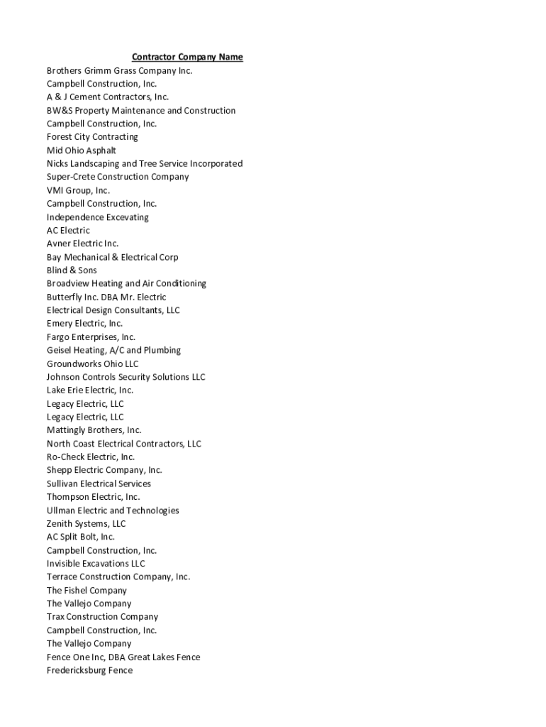Contractor Company Name Brothers Grimm Grass Company Inc. Campbell Construction, Inc. A & J Cement Contractors, Inc. BWS Property Maintenance and Construction Campbell Construction, Inc. Forest City