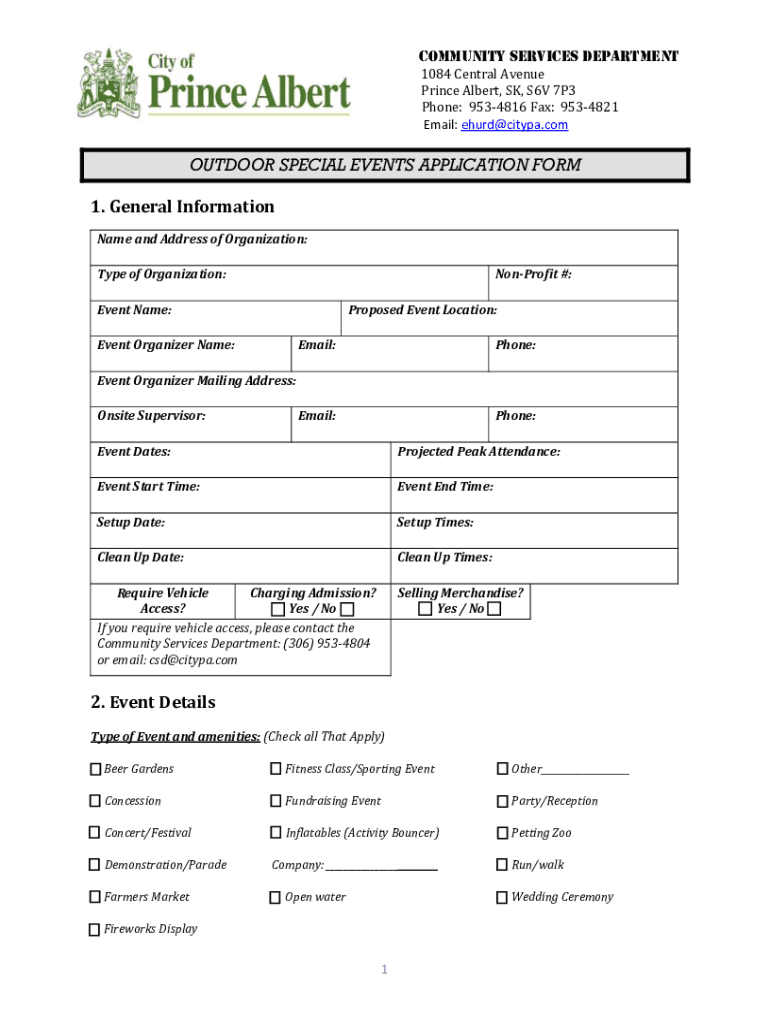 COMMUNITY SERVICES DEPARTMENT 1084 Central Avenue Prince Albert, SK, S6V 7P3 Phone: 9534816 Fax: 9534821 Email: ehurd@citypa.comOUTDOOR SPECIAL EVENTS APPLICATION FORM 1. General Information Name