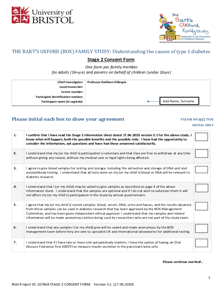 THE PARTS OXFORD (BOX) FAMILY STUDY: Understanding the causes of type 1 diabetes Stage 2 Consent Form One form per family member for adults (16+yrs) and parents on behalf of children (under 16yrs)