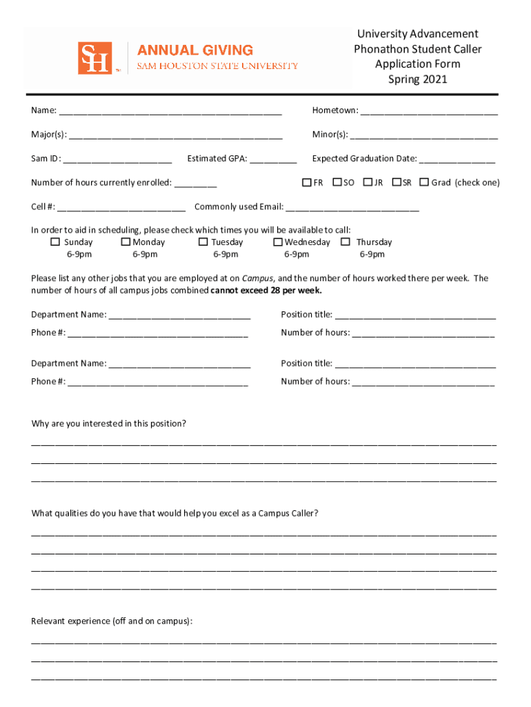 University Advancement Phonation Student Caller Application Form Spring 2021 Name: ___Hometown: ___Major(s): ___Minor(s): ___Sam ID: ___Expected Graduation Date: ___Estimated GPA: ___Number of hours