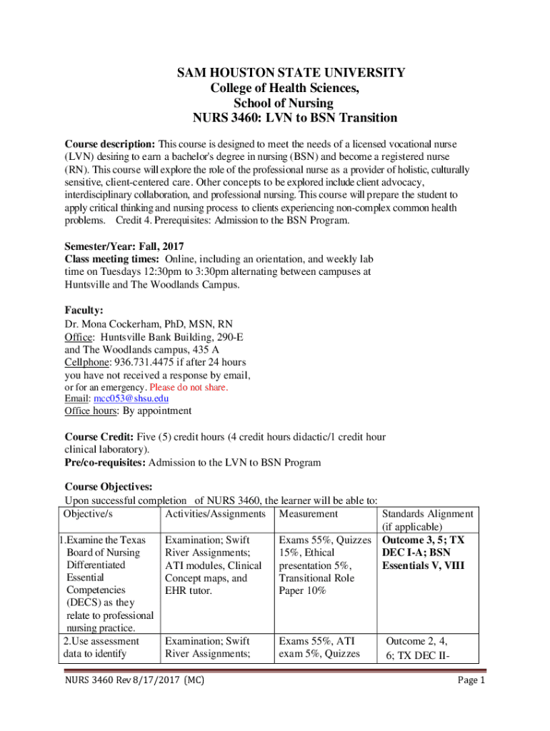 SAM HOUSTON STATE UNIVERSITY College of Health Sciences, School of Nursing NURSE 3460: LVN to BSN Transition Course description: This course is designed to meet the needs of a licensed vocational