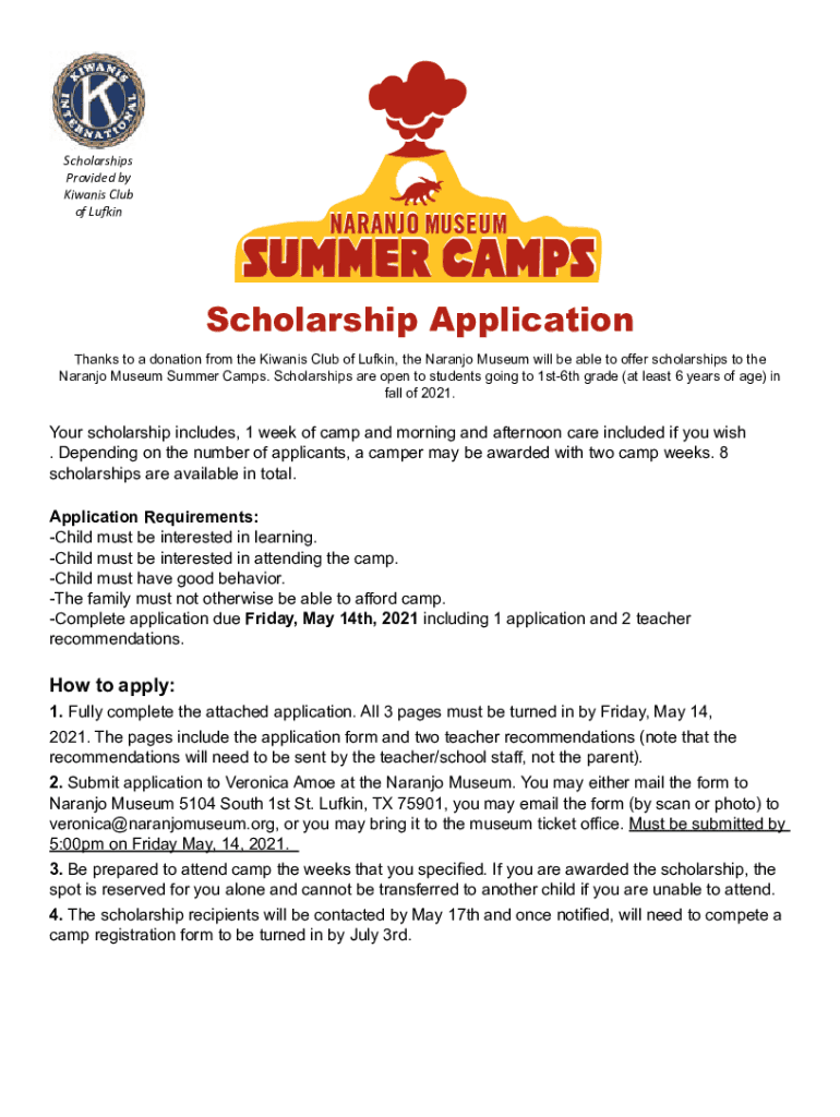 Scholarships Provided by Kiwanis Club of LufkinScholarship Application Thanks to a donation from the Kiwanis Club of Ruskin, the Navajo Museum will be able to offer scholarships to the Navajo Museum