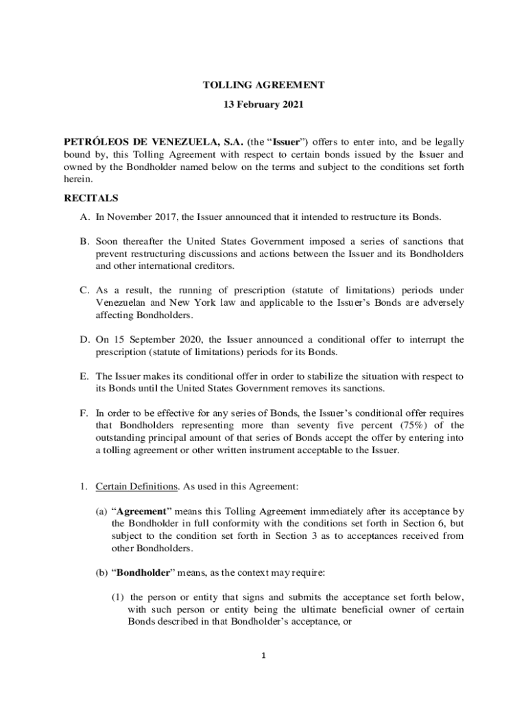 TOLLING AGREEMENT 13 February 2021PETRLEOS DE VENEZUELA, S.A. (the Issuer) offers to enter into, and be legally bound by, this Tolling Agreement with respect to certain bonds issued by the Issuer