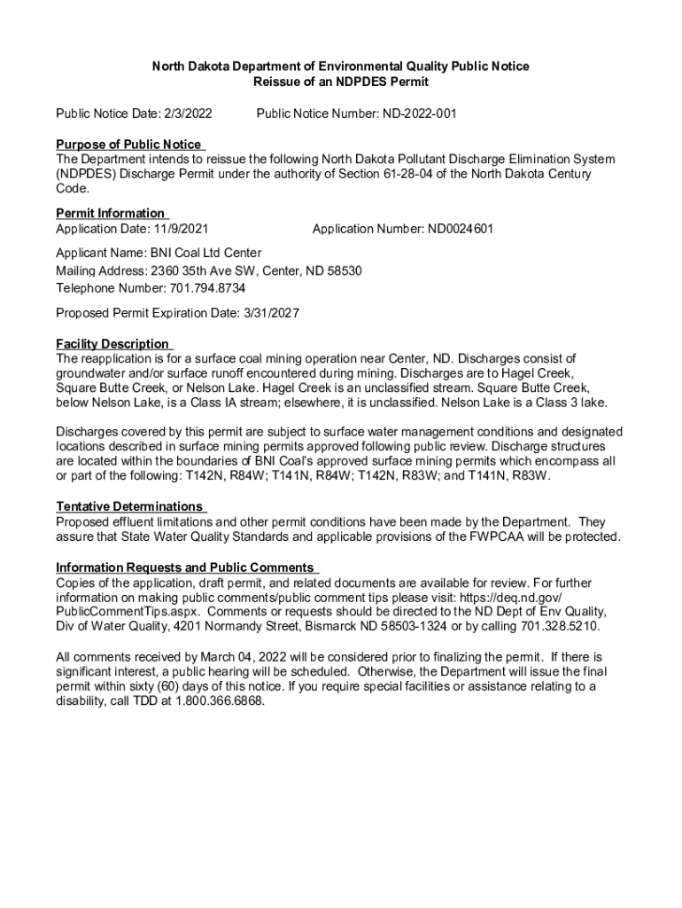 North Dakota Department of Environmental Quality Public Notice Reissue of an NODES Permit Public Notice Date: 2/3/2022Public Notice Number: ND2022001Purpose of Public Notice The Department intends