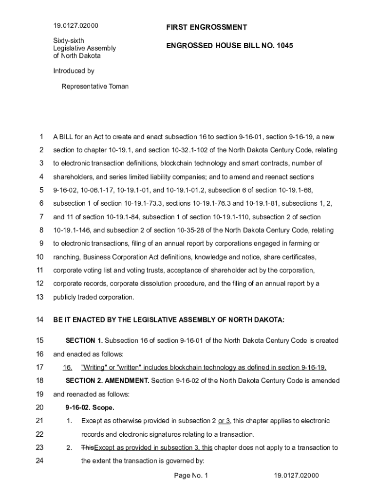19.0127.02000FIRST ENGROSSMENTSixtysixth Legislative Assembly of North DakotaENGROSSED HOUSE BILL NO. 1045Introduced by Representative Toman1A BILL for an Act to create and enact subsection 16 to