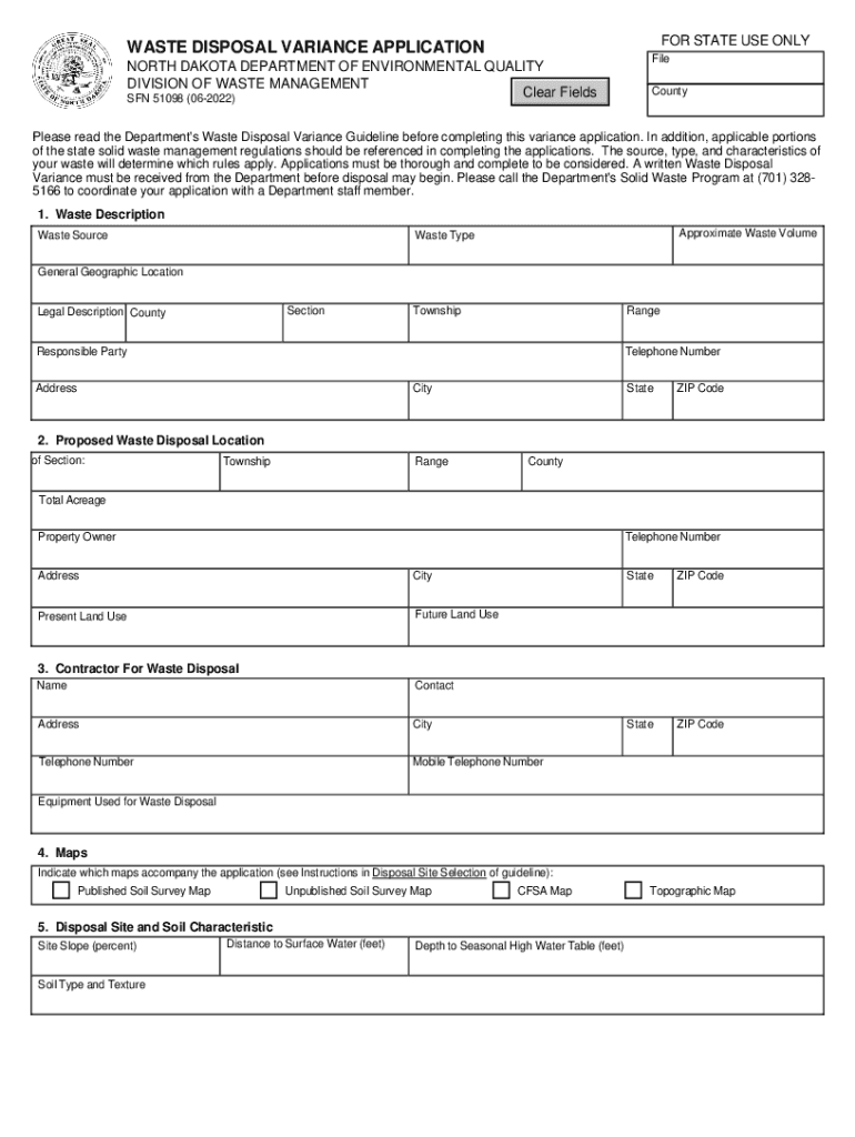 FOR STATE USE ONLYWASTE DISPOSAL VARIANCE APPLICATION NORTH DAKOTA DEPARTMENT OF ENVIRONMENTAL QUALITY DIVISION OF WASTE MANAGEMENT Clear Fields SON 51098 (062022)File CountyPlease read the Department\'s