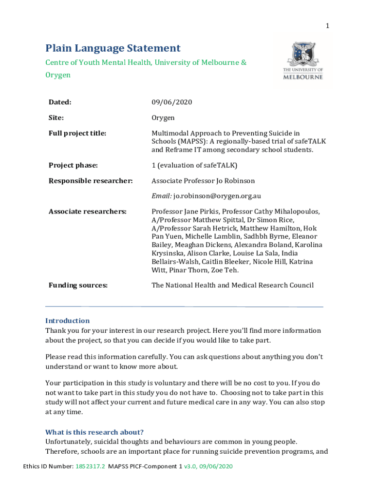 1Plain Language Statement Center of Youth Mental Health, University of Melbourne & Oxygen Dated:09/06/2020Site:OrygenFull project title:Multimodal Approach to Preventing Suicide in Schools (MASS):