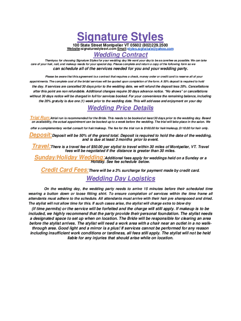 Signature Styles 100 State Street Montpelier VT 05602 (802)229.2500 Website:signaturestylesvt.com Email:styles.signature@yahoo.comWedding Contract Thank you for choosing Signature Styles for your