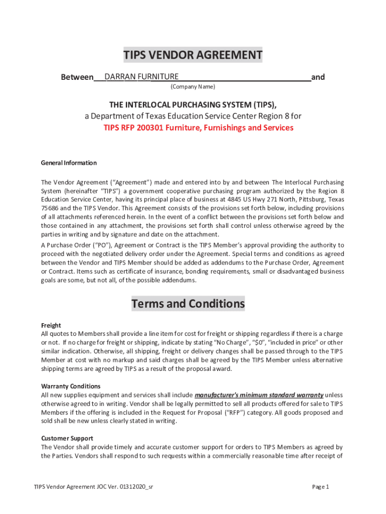 TIPS VENDOR AGREEMENT ZZE&hZE/kHz Between___and(Company Name)THE INTERLOCK PURCHASING SYSTEM (TIPS), a Department of Texas Education Service Center Region 8 for TIPS RFP 200301 Furniture, Furnishings