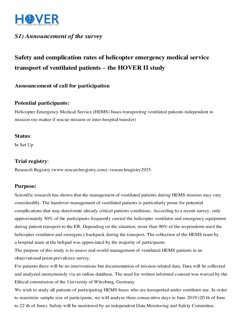 S1) Announcement of the surveySafety and complication rates of helicopter emergency medical service transport of ventilated patients the HOVER II study Announcement of call for participation Potential