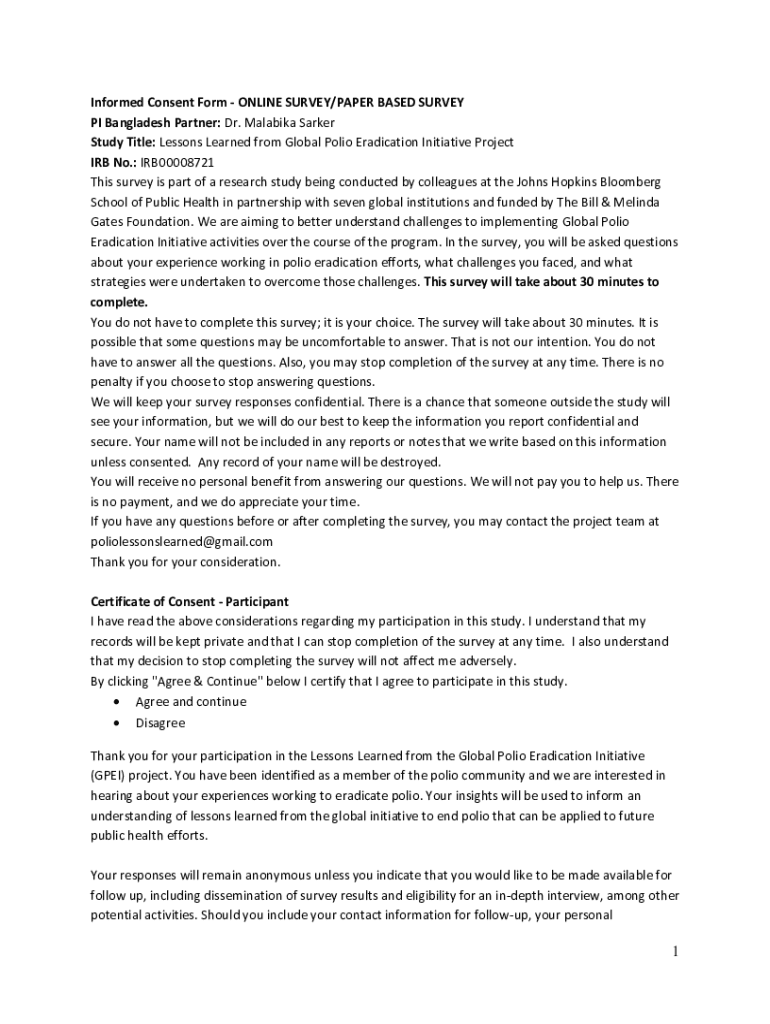 Informed Consent Form ONLINE SURVEY/PAPER BASED SURVEY PI Bangladesh Partner: Dr. Malaria Parker Study Title: Lessons Learned from Global Polio Eradication Initiative Project IRB No.: IRB00008721