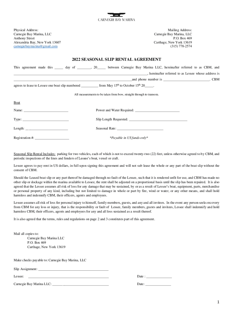 Physical Address: Carnegie Bay Marina, LLC Anthony Street Alexandria Bay, New York 13607 carnegiebaymarina@gmail.comMailing Address: Carnegie Bay Marina, LLC P.O. Box 469 Carthage, New York 13619