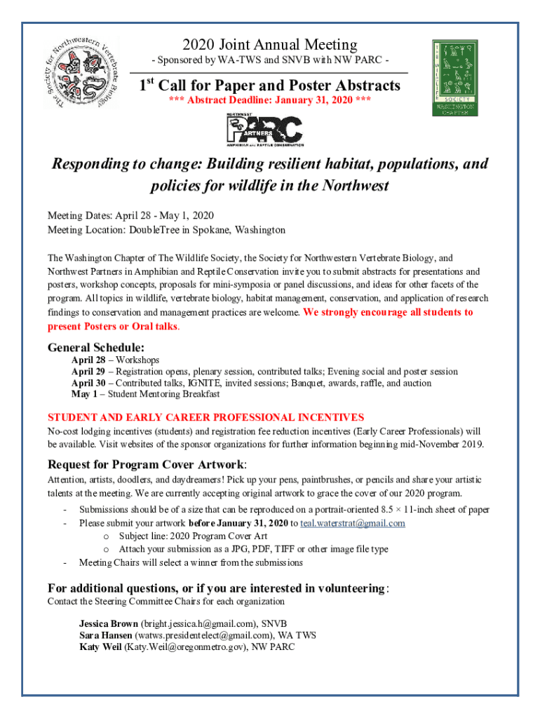 2020 Joint Annual Meeting Sponsored by WATTS and SNUB with NW PARC 1st Call for Paper and Poster Abstracts *** Abstract Deadline: January 31, 2020 ***Responding to change: Building resilient habitat,