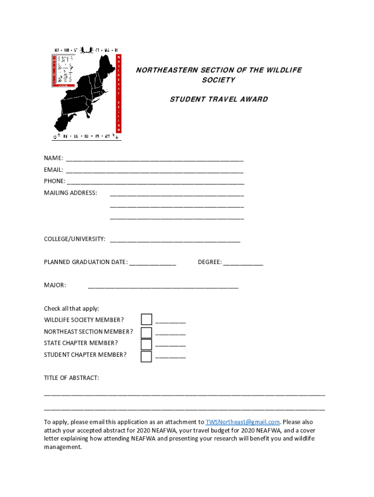 NORTHEASTERN SECTION OF THE WILDLIFE SOCIETY STUDENT TRAVEL AWARDEE: ___ EMAIL: ___ PHONE: ___ MAILING ADDRESS:___ ___ ___COLLEGE/UNIVERSITY: ___ PLANNED GRADUATION DATE: ___ MAJOR:DEGREE: ______Check