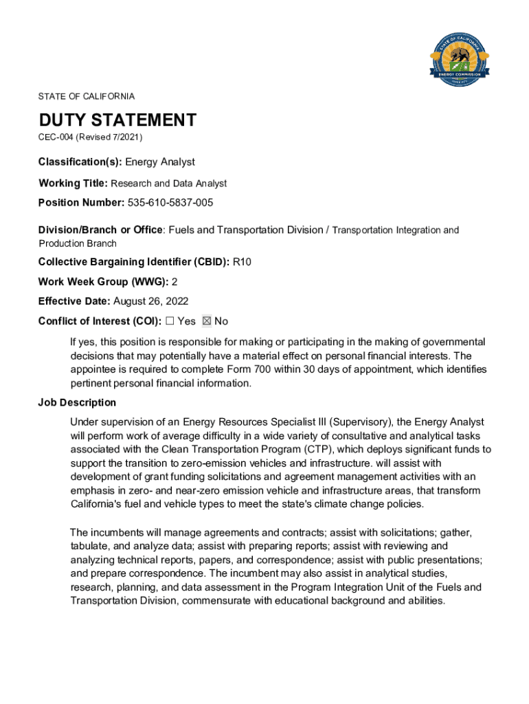 STATE OF CALIFORNIADUTY STATEMENTCEC004 (Revised 7/2021)Classification(s): Energy Analyst Working Title: Research and Data Analyst Position Number: 5356105837005 Division/Branch or Office: Fuels and