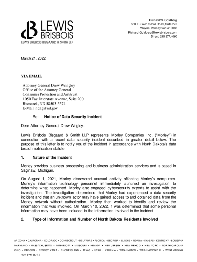 Get the free Notice of Data Security Incident - North Dakota Attorney General