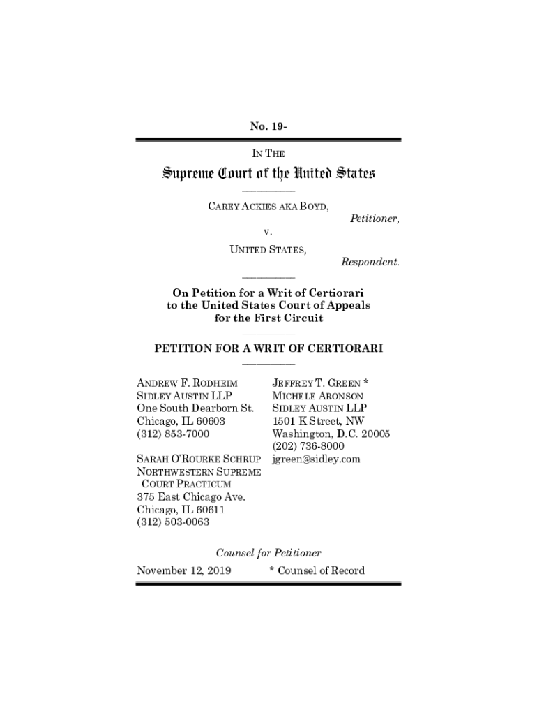 No. 19IN Supreme Court of the United States ___CAREY ACK IES AKA BOYD, v. UNITED STATES, ___Petitioner, Respondent. On Petition for a Writ of Certiorari to the United States Court of Appeals for the