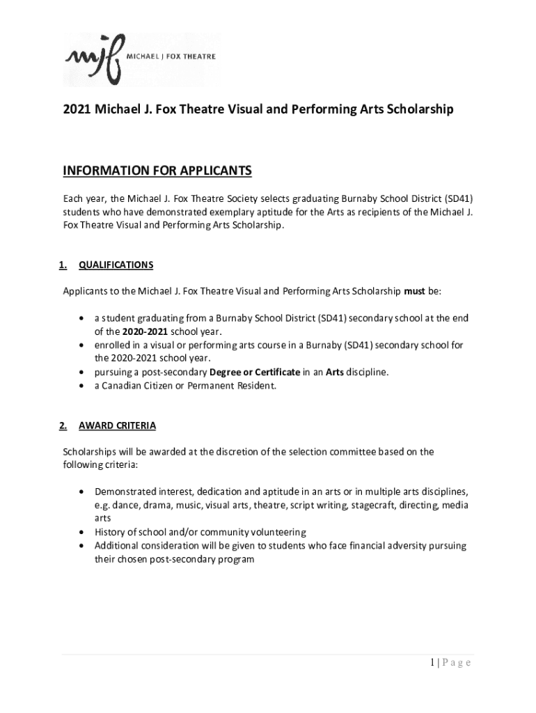 2021 Michael J. Fox Theater Visual and Performing Arts ScholarshipINFORMATION FOR APPLICANTS Each year, the Michael J. Fox Theater Society selects graduating from Burnaby School District (SD41) students