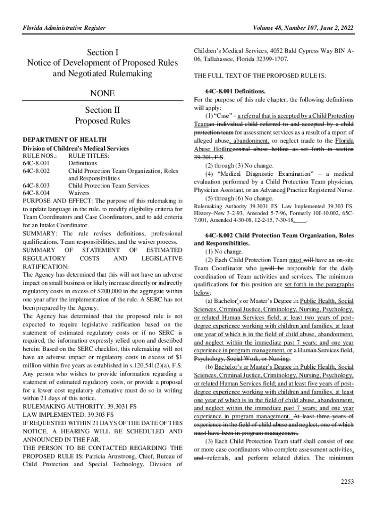 Florida Administrative RegisterVolume 48, Number 107, June 2, 2022Section I
