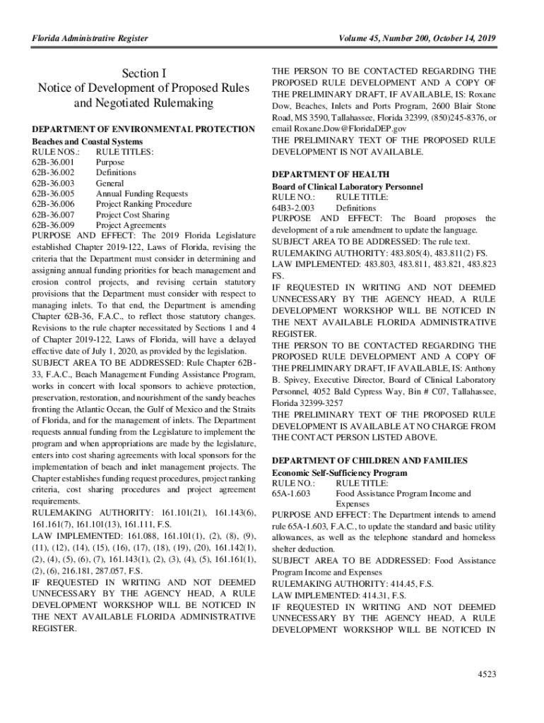 Florida Administrative RegisterSection I Notice of Development of Proposed Rules and Negotiated Rule making DEPARTMENT OF ENVIRONMENTAL PROTECTION Beaches and Coastal Systems RULE NOS.: RULE TITLES: