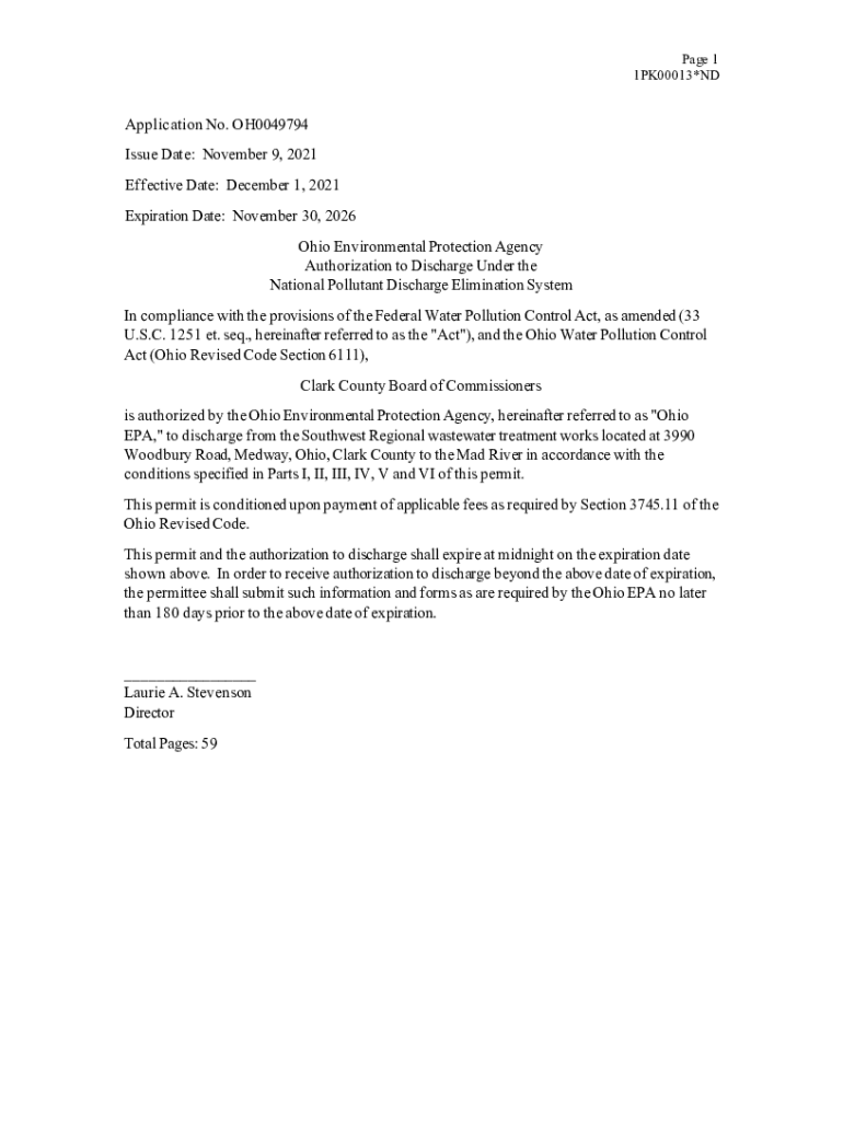 Page 1 1PK00013×Application No. OH0049794 Issue Date: November 9, 2021, Effective Date: December 1, 2021, Expiration Date: November 30, 2026 Ohio Environmental Protection Agency Authorization to