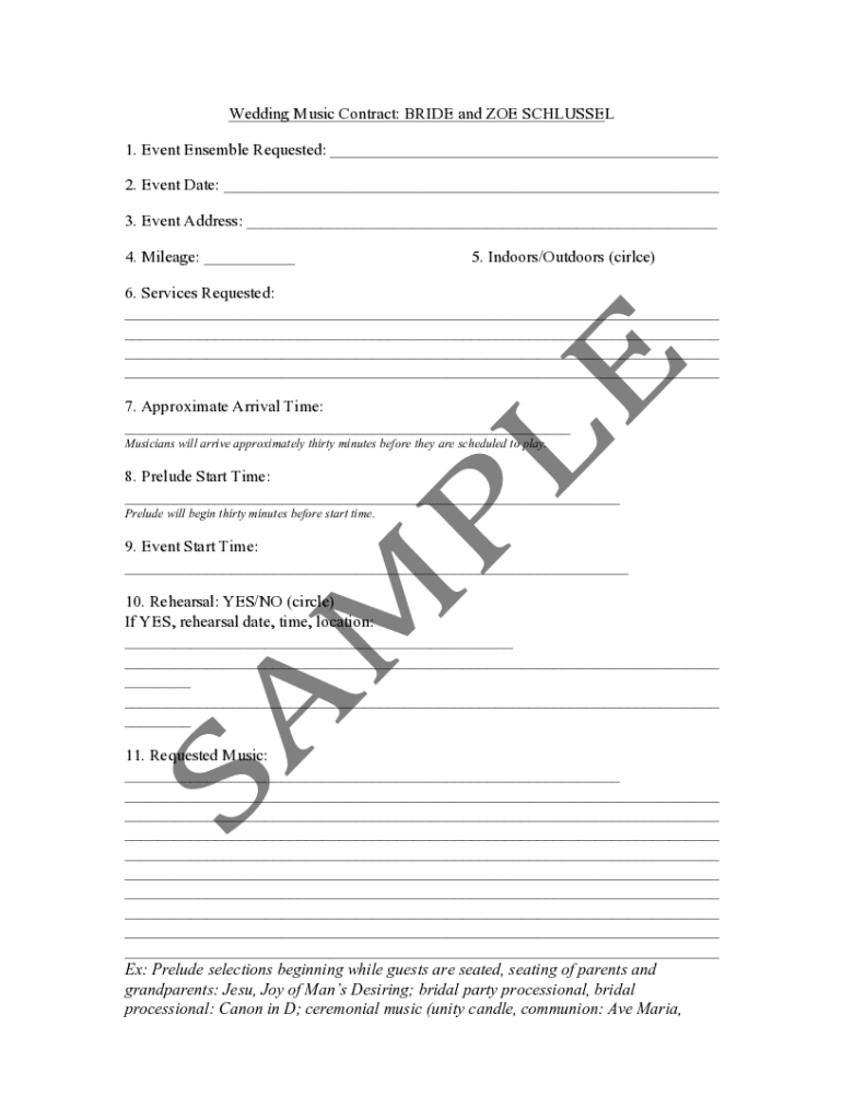 Wedding Music Contract: BRIDE and ZOE SCHUSSED 1. Event Ensemble Requested: ___ 2. Event Date: ___ 3. Event Address: ___ 4. Mileage: ___5. Indoors/Outdoors (circle)6. Services Requested: ___ ___ ___