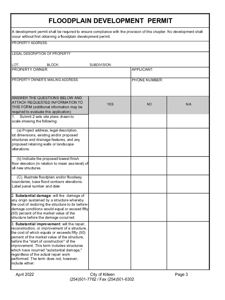 To fill out the TX Floodplain Development Permit, applicants must provide detailed project information, including site plans, floodplain information, and descriptions of the proposed work. The form can typically be obtained from the City of Killeen's website or the planning department.