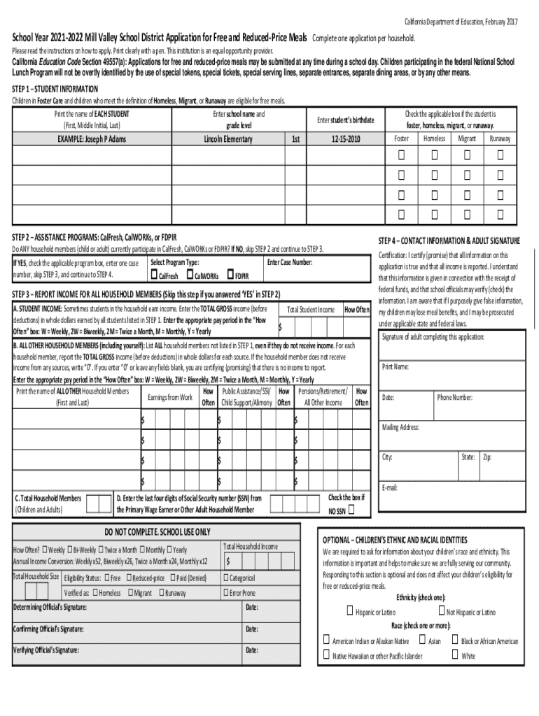 California Department of Education, February 2017School Year 20212022 Mill Valley School District Application for Free and Reduced Price Meals Complete one application per household. Please read the