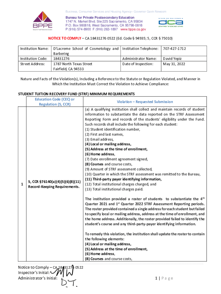 Get the free Bureau for Private Postsecondary Education - Notice to Comply - D'Lacreme School of ...
