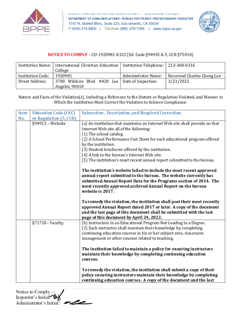 Get the free Bureau for Private Postsecondary Education - Notice to Comply - International Christ...
