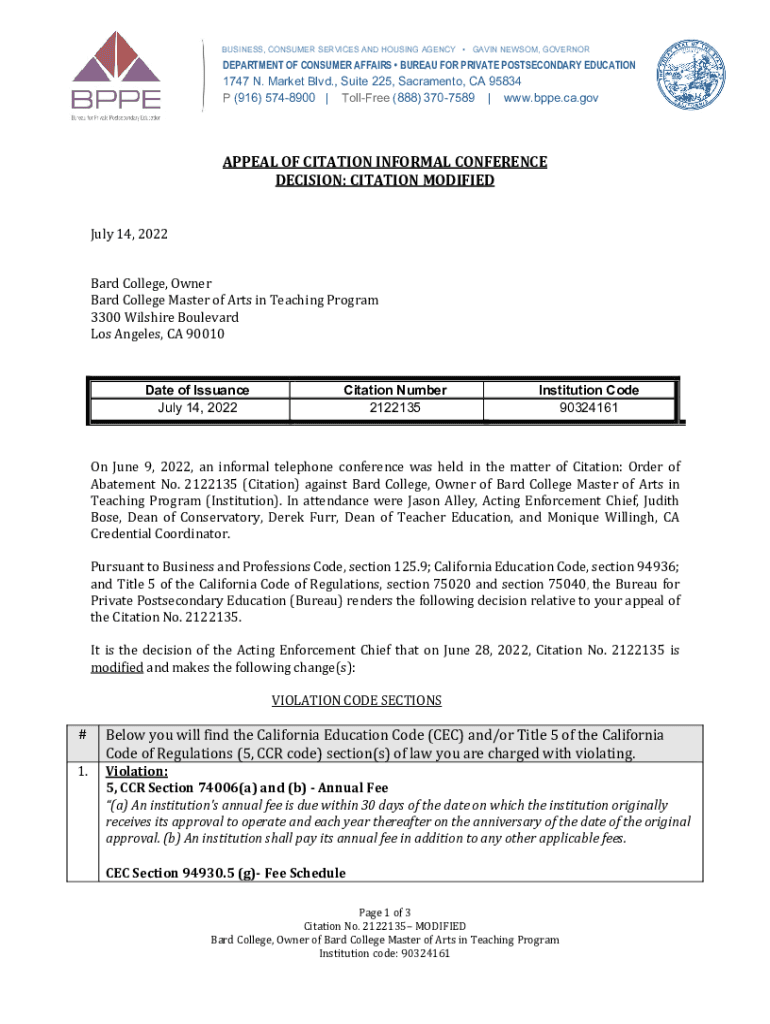 Get the free Bureau for Private Postsecondary Education - Appeal of Citation Infromal Conference ...