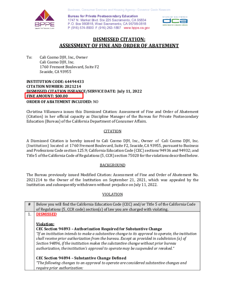 Get the free Bureau for Private Postsecondary Education - Dismissed Citation. Bureau for Private ...