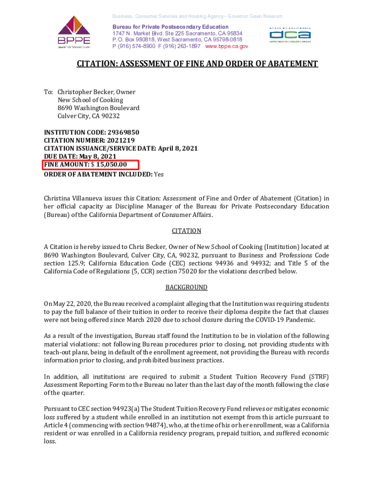 Information such as enrollment numbers, graduation rates, and job placement statistics must be reported on new school of cooking.
