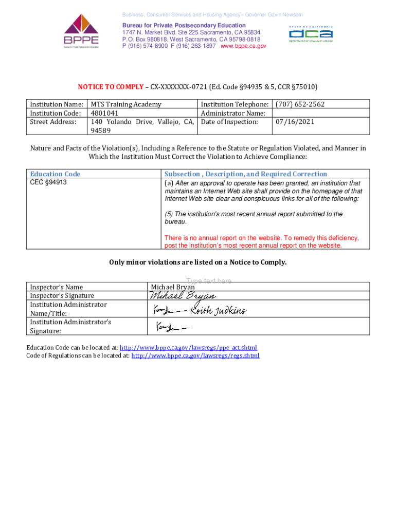 Get the free Bureau for Private Postsecondary Education - Notice to Comply - MTS Training Academy...