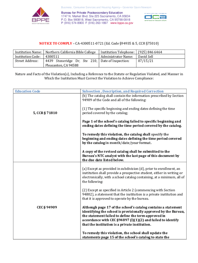 Get the free Bureau for Private Postsecondary Education - Notice to Comply - Northern California ...