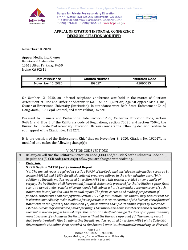 Get the free Bureau for Private Postsecondary Education - Brentwood University - Citation Modifie...