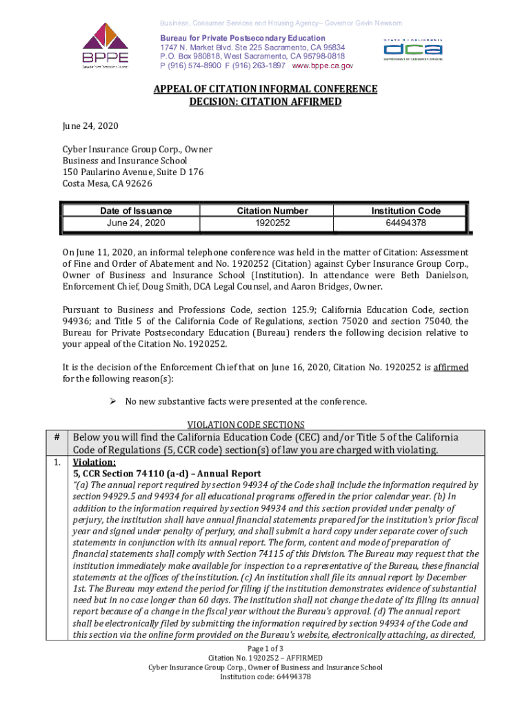 BPPEBusiness, Consumer Services and Housing Agency Governor Gavin NewsomBureau for Private Postsecondary Education 1747 N. Market Blvd. Ste 225 Sacramento, CA 95834 P.O. Box 980818, West Sacramento,