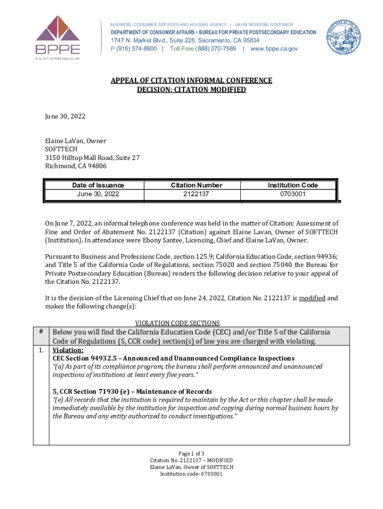 Get the free Bureau for Private Postsecondary Education - Softtech - Appeal of Citation Informal ...