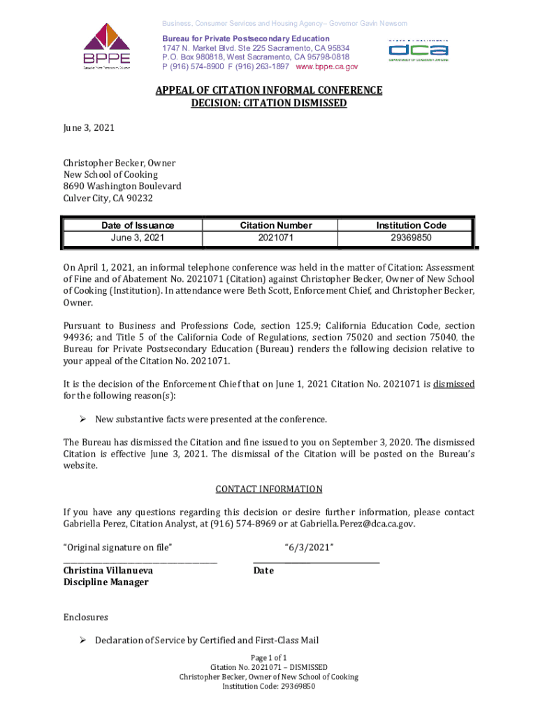 Get the free New School of Cooking - Appeal of Citation Informal ... - BPPE